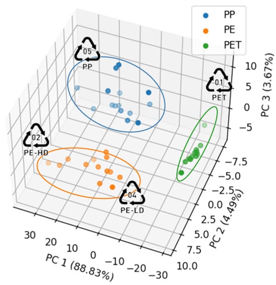 We verify that spectra from the same class cluster together in a specific region of the space and that different clusters are well-separated from one class to another. Furthermore, we notice that intra-class variances (related to the variances in samples chemical composition) are reflected in the positions of the PCA-3D projections. For example, the proportions of PE-HD vs. PE-LD in PE samples are captured along the axis of variance within the point cloud.