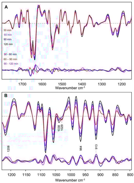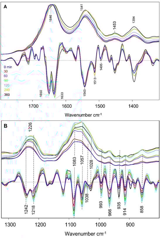 Comparison of the averaged second derivative of the ATR-FTIR spectra recorded for bacterial cells within the lag phase in the (A) 1800–1180 cm−1 and (B) 1250–790 cm−1 ranges. Also shown are three difference spectra obtained by subtracting the spectrum at one time point from the spectrum at the next nearest time point.