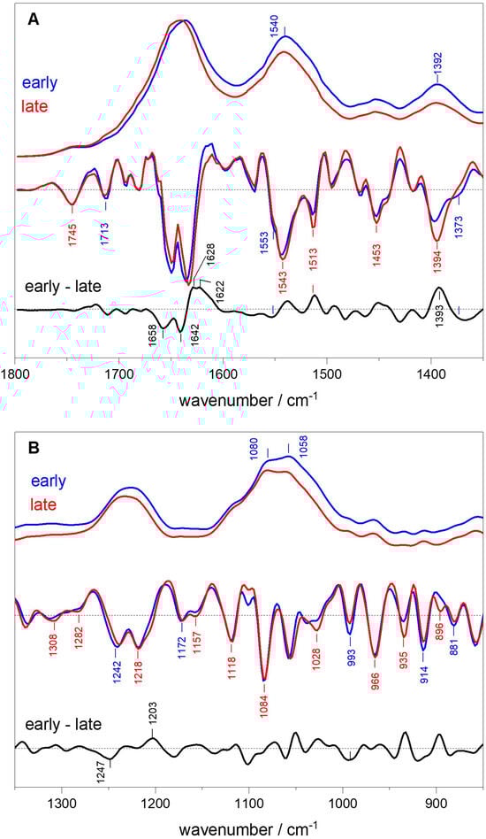 The second-derivative spectra in Figure 3A indicate a band near 1394 cm−1 in the spectra of late log-phase cells, which is weaker in the spectra of early log-phase cells. These differences give rise to an intense positive feature at 1393 cm−1 in the early–late difference spectrum (Figure 3A). The band at 1393 cm−1 may be due to the CH bending vibrations of the protein methyl groups (Table S1). It is of note that the difference features in the ~2920 cm−1 region (CH stretch region) are considerably weaker than those in Figure 3 and are of less diagnostic utility. An intense feature at ~1394 cm−1 in the late log phase that is diminished in the early log phase was also observed previously [20]. In the ATR-corrected early–late difference spectrum, a peak is found near 1397 cm−1 (Figure S6A).