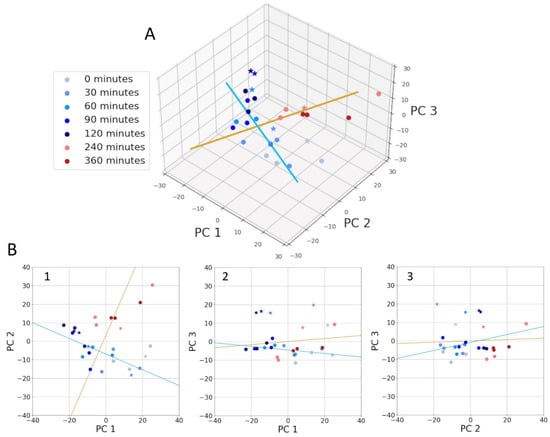 In the 3D PC space with the first three PCs (Figure 4A), we project all the blue data points (cells during early log phase) onto the blue trend line and measure their distance from the point at time zero. The result, shown in Figure 10A, reflects how the spectra follow the temporal trend. Statistically significant differences are observed between the spectra at 0 and 60 min (p-values < 0.05) and between 30 and 90 min (p-values < 0.1). However, no significant difference is detected between the spectra at 60 and 120 min. These results indicate that the most significant spectral (and likely biomolecular) changes occur within the first 60 to 90 min after inoculation. Additionally, no significant differences are found in spectral data from time points 30 min apart.