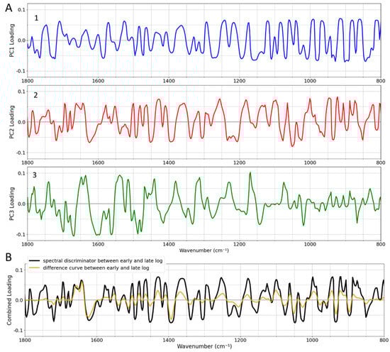 To connect the PCA data (Figure 4) with the early–late difference spectra in Figure 3, we analyze the PC loadings. These loadings, calculated as the elements of each eigenvector associated with each PC, are shown in Figure 5A. They highlight the frequencies that are important for each PC. The loadings together can help to assess frequencies of particular importance. The orange line in Figure 4 represents the optimal combination of PCs for separating early and late log-phase spectra. This direction of maximum separation was determined by calculating the centroids of both classes and identifying the line in 3D PC space that connects the centroids. The so-called “spectral discriminator” in Figure 5B is a linear combination of the three loadings, indicating the frequencies most relevant for discriminating the two phases. This discriminator simplifies the identification of key frequencies and is more robust to small changes in the data compared to individual loadings. The peaks in the spectral discriminator largely align with those in the early–late difference spectrum, confirming that this statistical approach supports the visual distinctions observed in the spectra.