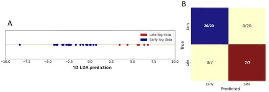 (A) Linear Discriminant Analysis (LDA) performed on the first three PCs, projecting spectra from early (blue) to late (red) log phases onto a single axis that maximizes between-group separation while minimizing within-group separation. The resulting projection clearly distinguishes the two classes. (B) Confusion matrix from leave-one-out cross-validation, indicating 100% accuracy in classifying spectra as early or late log phases.