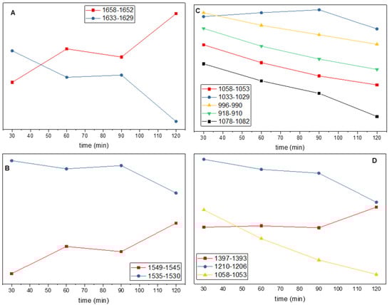 The time evolution of the features at 1395 and 1208 cm−1 is shown in Figure 8D. The time evolution of these features resembles the features in Figure 8B, suggesting that the 1395 and 1208 cm−1 features are related to α-helical and β-sheet protein structures.