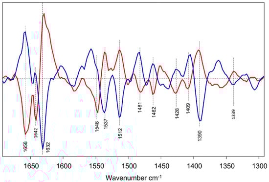 The late log-phase second-derivative spectrum in Figure 3B suggests absorption near 1308 and 1282 cm−1 that is lacking in the lag phase spectrum. These features may be due to changing polysaccharide contributions within the cells in the different phases (Table S1) [33]. Amide III absorption may also occur in this spectral region [34].