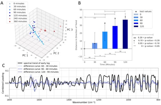 (A) PCA plot from Figure 4A with the blue line tracing the temporal trend of early log-phase spectra over time (shaded from light to dark blue). (B) Quantification of this temporal trend in PC space for early log-phase samples. Bars represent means with 90% confidence intervals. Horizontal lines indicate p-values for comparisons between 30 min and 60 min intervals, with statistical significance denoted by stars (*, 0.05 < p < 0.10; ** 0 < p < 0.05) and non-significant comparisons marked by circles (o, 0.2 > p > 0.1; oo; p > 0.2). (B) Combined PC loadings (black) projected onto the direction of the early log-phase trend (blue line from (A)). Higher values correspond to lower diagnostic relevance of the corresponding wavenumbers in capturing early log-phase dynamics. (C) Overlaid inverted difference curves (light to dark blue) from Figure 7 illustrate 30-min incremental changes in spectral features.