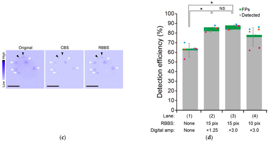 Figure 2. Improving the automatic detection of TDP25 aggregates in Neuro2a cells by the increase in signal-to-noise ratio. (a) Histogram of mean fluorescence intensities of GFP-TDP25 aggregates detected (n = 621) and undetected (n = 277) using PunctaFinder (green and magenta, respectively). The y-axis represents the cumulative number of aggregates included in each corresponding fluorescence intensity bin. (b) (left) Typical LSM images of Neuro2a cells harboring aggregates, with fluorescence intensity digitally amplified (digital amp: None, ×1.25, and ×3.0 amp.). The color scale on the left of the microscope images represents the pseudocolor look-up table. Bar = 10 μm. (right) Detection efficiency of the detected aggregates (gray) and FPs (green) when the fluorescence intensity was digitally amplified. NS: No significant difference between the three samples (p ≥ 0.05). (c) Typical LSM images of a Neuro2a cell that harbors aggregates, where the fluorescence intensity of some aggregates is lost with CBS, but not with RBBS. Original refers to the image without background subtraction. The color scale on the left of the microscope images represents the pseudocolor look-up table. The black and white arrowheads indicate the positions of lost and remaining aggregates, respectively. Bars = 10 μm. (d) Detection efficiency of cells harboring aggregates in the cytoplasm when changing the ball size in RBBS (15 or 10 pixels) and the digital intensity amplification value (×1.25 or ×3.0). The bars and dots show the results from three independent trials (mean ± SD; n = 3). The color of the dots corresponds to the trials. The data with no subtraction as a control in (b,d) uses the same one. Statistical significance: * p < 0.05 and NS: Not significant (p ≥ 0.05).
