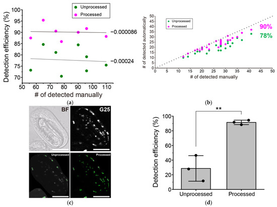 Figure 3. Improving detection accuracy by decreasing the number of detection targets in the image. (a) Correlation between the detection efficiency of Neuro2a cells harboring aggregates of GFP-TDP25 in the cytoplasm and the number of aggregates in a single image. The detection efficiency is shown before and after RBBS and digital intensity amplification processing (unprocessed and processed, respectively). The line shows a linear regression, with the regression slopes shown on the right side of the lines. (b) The correlation between the number of Neuro2a cells positive for aggregates, as detected automatically and manually, when the number of cells positive for aggregates in an analytical field of view is reduced by cropping the image. The dotted line shows the 100% accuracy (y = x). The inset values show the total detection efficiency of all processed (green) or unprocessed (magenta) samples. (c,d) Automatic detection of GFP-TDP25 aggregates in live nematode embryos. (c) Confocal fluorescence and bright-field images of a nematode embryo (top). The green overlayed spots indicate the position of the PunctaFinder-detected aggregates in the embryo in unprocessed and processed confocal fluorescence images (bottom). Bars = 20 μm. (d) Comparison of the detection efficiency of aggregates in nematode embryos between unprocessed and processed confocal fluorescence images. The bars and dots show three independent trials (mean ± SD; n = 3). Statistical significance: ** p < 0.01.
