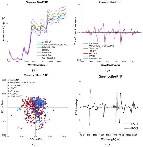Figure 1. NIR spectral characteristics in whole green coffee beans (750–2450 nm) acquired from samples processed using seven different post-harvest processing (PHP) methods (n = 524). (a) Raw averaged NIR spectral signatures with Baseline Correction show the characteristic spectral pattern of green coffee across different PHP methods. (b) Transformed spectra reveal enhanced vibrational features but no clear separation among PHP methods. (c) PCA scores plot displaying sample distribution based on the first two principal components (PC-1 = 50%, PC-2 = 20%), highlighting clustering trends by the PHP method. (d) PCA loadings show dominant wavelengths that influence the PCA scores plot.