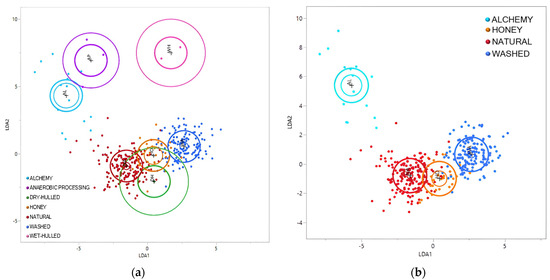 Two PCA-LDA models were developed to assess the classification performance of NIRS in distinguishing PHP methods in whole green coffee beans. This two-model approach was designed to balance comprehensive classification with realistic generalization. By comparing a model trained on the full dataset against one excluding underrepresented categories, the classification reliability was evaluated under both ideal and practical field conditions, supporting real-world applicability in PHP verification. The initial model, trained on the entire dataset, successfully classified seven PHP methods—Alchemy, Anaerobic Processing, Dry Hulled, Honey, Natural, Washed, and Wet-Hulled—achieving an overall accuracy of 96.5%, with 98.3% sensitivity and 99.7% specificity (Table 2). These high values indicate a strong ability to correctly identify PHP methods while minimizing false positives. The LDA scores plot (Figure 2a) illustrates distinct clustering patterns, where each PHP method is well-separated, confirming the robustness of the model in differentiating post-harvest techniques based on spectral signatures. Analyzing the individual classification performance per PHP method, Alchemy and Anaerobic Processing exhibited the highest classification confidence, achieving over 99% sensitivity and specificity, reflecting their highly distinct spectral profiles. Wet-Hulled and Dry-Hulled also demonstrated strong classification performance, with sensitivity values exceeding 97%, highlighting their unique processing characteristics that result in clearly distinguishable spectral patterns. Washed coffee samples were correctly classified with 96.8% sensitivity and 98.5% specificity, showing a consistent spectral fingerprint. Honey and Natural processing methods displayed the highest misclassification rates, though they still maintained above 94% sensitivity and specificity. This classification overlap is expected, as both techniques retain significant amounts of mucilage during drying, resulting in similar chemical compositions and, consequently, spectral similarities [4,12]. These overlapping profiles reduce the discriminative power of linear classifiers in these cases. Nonetheless, the high accuracy, sensitivity, and specificity across the full model, especially in more chemically distinct processes like Alchemy and Washed, reinforce the robustness of the NIRS-based approach for practical PHP verification in commercial settings. Anaerobic Processing, Dry-Hulled, and Wet-Hulled achieved 100% accuracy, sensitivity, and specificity in the PCA-LDA model trained on the entire dataset (Table 2). It is important to note that these categories were represented by a limited number of samples. As such, their high classification performance should be interpreted with caution, as the lower variability in these small sample sets may have inflated model metrics. To address this, a second model was constructed using only the four most represented PHP categories—Alchemy, Honey, Natural, and Washed—and included an independent test set to evaluate model generalization.