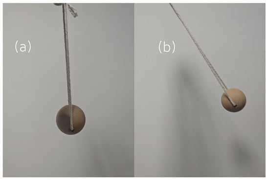 This study utilized Xinjiang’s characteristic ‘Korla’ pears as experimental subjects, whose thin, fragile epidermis and delicate flesh make them particularly susceptible to mechanical damage during postharvest handling. Three hundred defect-free fruits with intact epidermis and no pest infestation were selected through rigorous market screening. A controlled mechanical impact method was employed to simulate postharvest latent damage, constructing a representative damaged sample set. The experimental setup, shown in Figure 1a, consisted of a pendulum impact system comprising a horizontal rotating shaft, an adjustable 30 cm pendulum rope, and a 100 g wooden sphere. Figure 1b shows the position of the pendulum before it falls at an angle that is accurately adjustable. By adjusting the pendulum angle (30°–60°), the impact energy was controlled within 0.05–0.12 J to meet IFPA Class I fresh produce damage standards []. The impact energy was calculated as