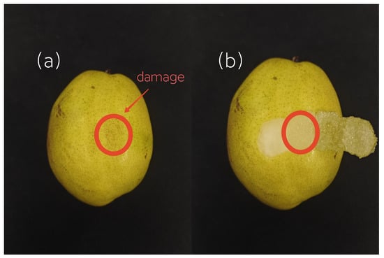 (a) View of damaged pear surface; (b) Healthy versus damaged tissue of pears.