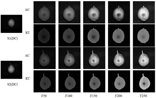 In subsurface bruised regions of pears, RT images provide a more uniform background. Due to the curvature of the pear surface, RT images play a positive role in correcting intensity distortion, effectively mitigating the impact of uneven illumination. In contrast, AC images exhibit noticeably darker edges in the background. As the spatial frequency increases, the overall brightness of RT images rises. However, at higher spatial frequencies, excessive overall brightness leads to reduced bruise contrast, causing the bruised area to fade or be surrounded by darkened regions.