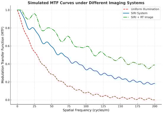 Figure 5 shows the simulated modulation transfer function (MTF) curves under different imaging systems. In practical systems, optical aberrations, noise interference, and hardware response fluctuations cause slight high-frequency oscillations in the curves: The red dashed line (Uniform Illumination) simulates traditional illumination, where high-frequency details attenuate rapidly and are heavily affected by noise. The blue solid line (SIRI System) represents the structured light system, which enhances the mid-to-high frequency response and exhibits slight oscillations reflecting system response variations. The green dash-dot line (SIRI + RT Image) further enhances contrast and deep features, demonstrating the strongest detail preservation ability and the smoothest curve.