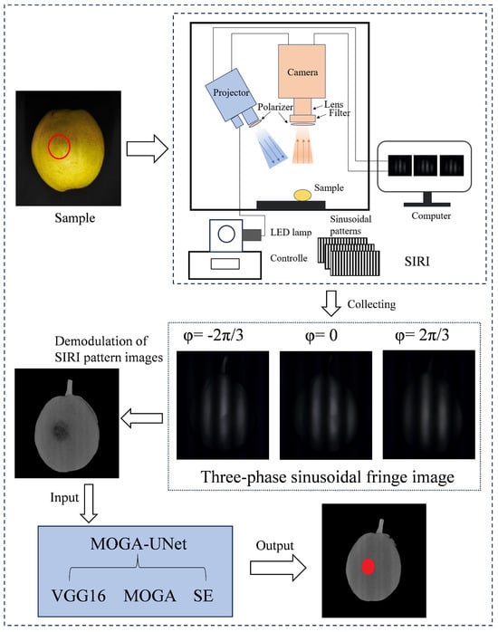 Bruising in ‘Korla’ pears represents a prevalent phenomenon that leads to progressive fruit decay and substantial economic losses. The detection of early-stage bruising proves challenging due to the absence of visible external characteristics, and existing deep learning models have limitations in weak feature extraction under complex optical interference. To address the postharvest latent damage detection challenges in ‘Korla’ pears, this study proposes a collaborative detection framework integrating structured-illumination reflectance imaging (SIRI) with multi-order gated attention mechanisms. Initially, an SIRI optical system was constructed, employing 150 cycles·m−1 spatial frequency modulation and a three-phase demodulation algorithm to extract subtle interference signal variations, thereby generating RT (Relative Transmission) images with significantly enhanced contrast in subsurface damage regions. To improve the detection accuracy of latent damage areas, the MOGA-UNet model was developed with three key innovations: 1. Integrate the lightweight VGG16 encoder structure into the feature extraction network to improve computational efficiency while retaining details. 2. Add a multi-order gated aggregation module at the end of the encoder to realize the fusion of features at different scales through a special convolution method. 3. Embed the channel attention mechanism in the decoding stage to dynamically enhance the weight of feature channels related to damage. Experimental results demonstrate that the proposed model achieves 94.38% mean Intersection over Union (mIoU) and 97.02% Dice coefficient on RT images, outperforming the baseline UNet model by 2.80% with superior segmentation accuracy and boundary localization capabilities compared with mainstream models. This approach provides an efficient and reliable technical solution for intelligent postharvest agricultural product sorting.