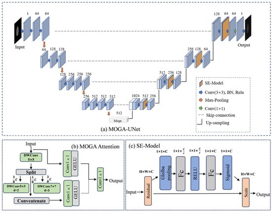 The MOGA-UNet architecture consists of a VGG encoder, a bottom MOGA module, a squeeze-and-excitation (SE) attention mechanism, and a decoder. Figure 7 illustrates the proposed framework. Based on the classical UNet architecture, the network innovatively integrates a multi-order gated aggregation (MOGA) module and an SE attention mechanism, forming a collaborative “encoding–feature fusion–decoding” process.