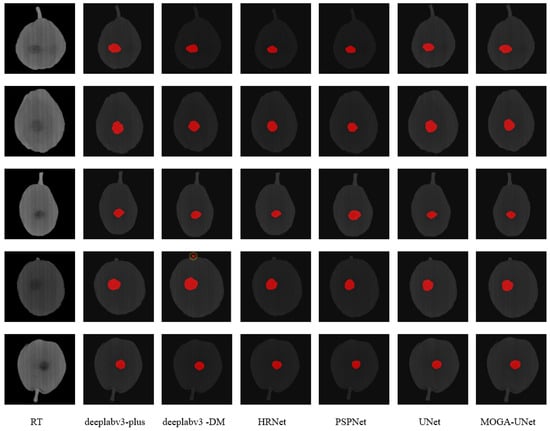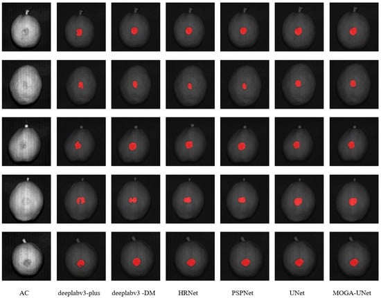 The model evaluation results with AC and RT images as independent data inputs are shown in Figure 8 and Figure 9. The charts indicate that the combination of SIRI technology and deep learning for detecting latent damage in ‘Korla’ pears is feasible, achieving satisfactory detection accuracy. The detection accuracy of the RT images is consistently superior to that of the AC images, which is consistent with visual inspection results. The MOGA-UNet model demonstrates the highest detection accuracy and the greatest model stability, exhibiting better detection results with image input.