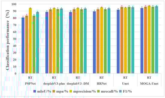 The RT image significantly improved the overall performance of all models. MOGA-UNet achieved an mIoU of 94.38%, which is a 0.28% improvement over the AC image, and its mRecall (96.27%) and mPrecision (97.80%) are more balanced, with a difference of only 1.53% (Figure 11). This indicates that the homogenization processing of RT images effectively mitigates the class imbalance issue. DeeplabV3-plus showed the largest performance improvement on RT images but still lags behind MOGA-UNet by an absolute difference of 5.6%. This result confirms that the feature enhancement effect of RT images needs to be combined with an adapted model architecture to fully leverage its potential.