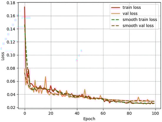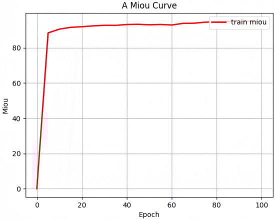 As shown in Figure 12 and Figure 13, the loss function and validation set mIoU trend of MOGA-UNet over 100 training epochs are presented. The loss value drops rapidly in the first 20 epochs (0.175 → 0.045) and then enters a stable convergence stage, with the final training/validation losses stabilizing at 0.028 ± 0.003 and 0.03 ± 0.005, respectively. The validation set mIoU reaches a peak of 94.38% after 80 epochs, with minimal overfitting (training/validation mIoU difference < 1.2%). An analysis of the curve fluctuations reveals local oscillations at epochs 45 and 78, which are related to the stage-wise activation of the online hard sample mining strategy. However, these fluctuations did not affect the final convergence stability, and the final values reached the desired results after improvement.