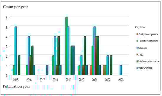 - Alves, M.N.R. Desenvolvimento e Validação de Metodologia Para Análise de Cocaína, Derivados e Metabólitos em Amostras de Mecônio Utilizando a Cromatografia em Fase Gasosa Acoplada à Espectrometria de Massas. Master Thesis, Universidade de São Paulo, São Paulo, Brazil, 2010. [Google Scholar]
