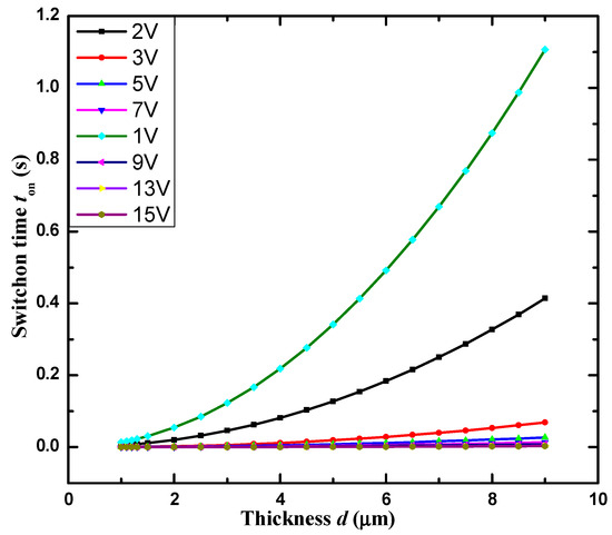 Curve for switch-on time versus active cell thickness at variable applied voltages.