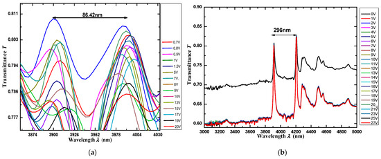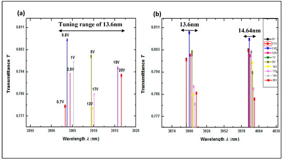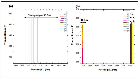 Figure 9a depicts the simulated transmission spectra for the first designed filter. The simulated results presented in Figure 9a were generated based on Equation (2), which provides the relationship between the transmission intensity against the wavelength and refractive index [4]. Almost 80% transmission was observed with a tuning range of 376 nm, which lies in the MIR regime with a wavelength range of 3658–4028 nm. The experimental results for filter 1 in the absence of an applied voltage are presented in Figure 9b. It can be clearly seen that at 0 V, 80% transmission is achieved at 3998 nm, verifying 80% transmission and the wavelength band of the simulated spectra shown in Figure 9a, confirming its suitability for MIR wavelength tuning.