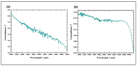 As shown in Figure 4a, two transmission peaks at 3899.94 nm and 3986.36 nm with maximum transmissions of 80.0% and 80.6% were obtained with a free spectral band of 86.42 nm for the Si-ITO-Ag filter (filter 1). Sharp and narrow transmission peaks at 3911 and 4207 nm with 80% and 82% of the maximum transmission, respectively, were obtained for G-ITO-Ag (filter 2), as shown in Figure 4b. A free spectral band of 296 nm was obtained for Filter 2. Standard glass substrates, as well as fused silica and quartz, exhibit significant absorption at wavelengths above ~3.5 µm higher absorption of silicon and the refractive index in MIR is ~1.4–1.5, which allows more wavelengths to pass through without significant attenuation. This contributes to the wider free spectral band of G-ITO-Ag (Filter 2). Simultaneously, because of the higher refractive index of Si in the MIR (~3.4–3.5), more selective interference patterns can be obtained, along with a stronger phase shift owing to stronger absorption. Consequently, the effective transmission of certain wavelengths is limited, ultimately narrowing the free spectral band of the Si-ITO-Ag filter (filter 1).