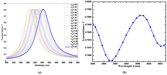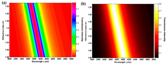 In this study, extraordinary refractive indices of 1.68 and 1.52 were considered at an incident angle (θ at 0). Two-dimensional plots of the dependencies between the refractive index and scanning wavelength with the corresponding transmission for both filters are shown in Figure 8. These plots help in designing filters with a proper choice of refractive indices at the central wavelength.
