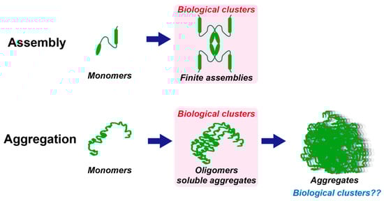 Concepts of biological clusters. In both assembly (top) and aggregation (bottom), monomers associate, leading to an increase in the number of molecules. However, assemblies stabilize at finite molecular numbers to form complexes, whereas aggregates involve vastly larger numbers of molecules and may not necessarily cease growing. Before progressing to large aggregates, intermediate states such as oligomers or soluble aggregates can exist as metastable species.