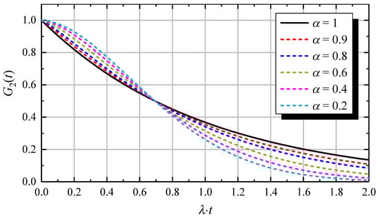 Importantly, with this more general power-law treatment, the perturbation function is no longer a simple exponential of the form , but rather it has a different functional dependence on time: for . This stretched exponential perturbation function will decay more slowly than the exponential function at smaller values of t and then decay more rapidly at larger values of t for values and selected such that both curves have the same halving time (Figure 2). To discriminate the pure exponentially decaying G2(t) from a stretched exponential, or the limiting case of a Gaussian function (α = 0), in particular, the behavior near t = 0 should be explored, while it is, of course, also necessary that the decay is appreciable over the time range of the measurement.