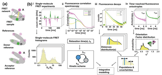 - Lerner, E.; Barth, A.; Hendrix, J.; Ambrose, B.; Birkedal, V.; Blanchard, S.C.; Börner, R.; Sung Chung, H.; Cordes, T.; Craggs, T.D.; et al. FRET-Based Dynamic Structural Biology: Challenges, Perspectives and an Appeal for Open-Science Practices. Elife 2021, 10, e60416. [Google Scholar] [CrossRef] [PubMed]