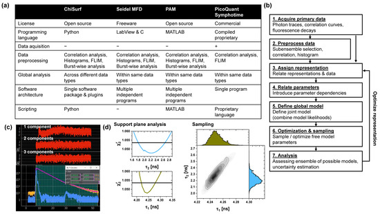 In response to these challenges, this paper introduces a comprehensive software solution tailored for the analysis of time-resolved fluorescence data. The software integrates advanced techniques and facilitates global modeling, parameter linking, and robust uncertainty estimation to tackle challenging tasks like resolving minor states in proteins through fluorescence decay analysis and uncertainty estimation of single FRET pairs [6]. The software has in the past supported the analysis of networks of distances [7,8,9,10,11] and provided combined time-correlated single-photon counting (TCSPC) and FCS analyses for error estimation in FRET networks [2] by sampling over variable parameters of a joint scoring function [12,13]. Furthermore, it has enabled fluorescence correlation spectroscopy (FCS) analysis in vitro [14,15] and in cellular environments, demonstrating its flexibility and applicability across a wide range of experimental systems [16]. With over a decade of use in the Seidel Lab and contributions to benchmark studies [17,18], the software has undergone extensive refinement, enhancing its quality, usability, and long-term maintainability to better serve the broader scientific community.