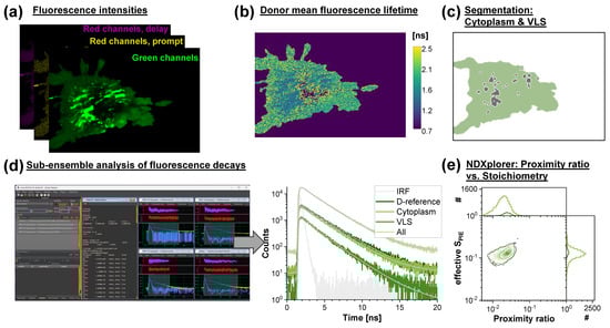 Here, can be factorized into , the time-dependent depopulation of the donor (FRET-induced donor decay), and . A more detailed description and an extension to Partial Donor–Donor Energy Migration (PDDEM), which served as the basis for the software implementation, can be found in Kalinin et al. [51].
