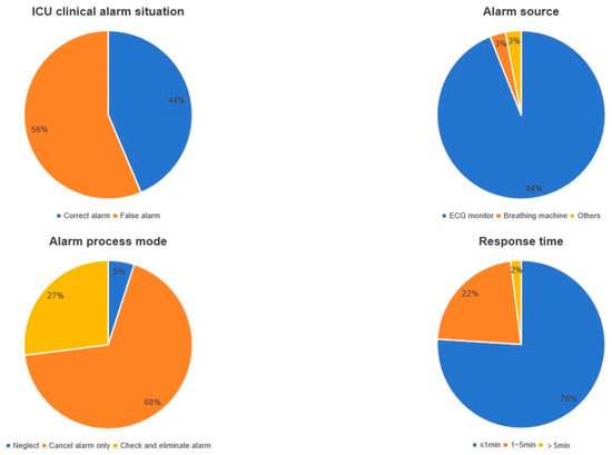 The ICU clinical alarm record results showed that a total of 621 alarms occurred on key medical equipment in the department every day on average. Most of the clinical alarms were secondary alarms, accounting for 61.79% of the total alarms, primary alarms accounted for 12.50% of the total alarms, and tertiary alarms accounted for 25.71% of the total alarms. As illustrated in Figure 1, a significant majority of clinical alarms were attributable to ECG monitoring equipment (93.93%). Among them, there were 350 false alarms, accounting for 56.36% of the total, and 271 correct alarms, accounting for 43.64% of the total, which is less than half. Among the correct alarms, clinically irrelevant and meaningless alarms, that did not reflect changes in the patient’s condition, accounted for 31.00% of the total number of correct alarms. Alarm process mode showed that the percentage of ignoring and not giving treatment was 5.36%; the percentage of only eliminating the alarm sound was 67.50%, among which the percentage of those generated due to false alarms or disturbances that really needed to eliminate the alarm sound only was 69.43%; the percentage of going to the bedside to check the patient’s condition to give treatment and eliminate the alarm sound was 27.14%, which means that the responding behaviors of actually checking the condition and solving the alarms were less than one-third. In response time, 76.07% of the alarms were responded to within 1 min, and 1.79% of the alarms were responded to in more than 5 min.