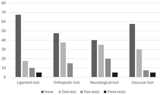 To evaluate the specific exclusion criteria of red flags, 37.5% used one or two types of assessments, and 25% used three types of assessments. Concerning specific tests, 67.5% did not use ligament tests, 47.5% did not use orthopedic tests, 40% did not use neurological tests, and 57.7% did not use vascular tests (Figure 1).