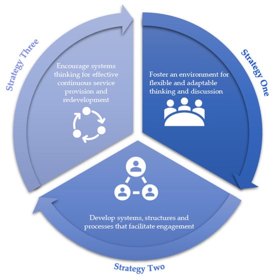 Effective service planning occurs by understanding how external factors, such as political, economic, and social environments, shape engagement and build trust [,,,]. Using the complex adaptive systems lens [] to extrapolate from the three key study insights, three interwoven strategies with 30 actions are proposed to assess, understand and respond to external factors (Figure 1; Table 4). The three strategies are as follows: strategy one—foster an environment that allows for flexible and adaptable thinking and discussion; strategy two—develop systems, structures and processes that facilitate engagement; and strategy three—encourage systems thinking for effective continuous service provision and redevelopment.