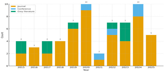 Based on these questions, relevant keywords—such as “SHC” and “SHC challenges” were used to search the Google Scholar database. Publications were selected based on relevance, credibility, and recency, with a focus on works published between 2015 and 2025, to include the most up-to-date research. This resulted in 63 articles in total, comprising 49 journal articles (≈78%), 5 conference papers (≈8%), and 9 gray-literature items (≈14%), as shown in Figure 2. A qualitative content analysis approach was employed to extract and code relevant information from the selected literature [36]. Thematic synthesis facilitated the organization of data into the paper’s core sections: the concept, drivers, characteristics, and challenges of SHC. Finally, the findings were presented in a clear, structured format that aligns with these themes, and the paper concludes with a discussion of key insights and their implications for healthcare stakeholders and future research.