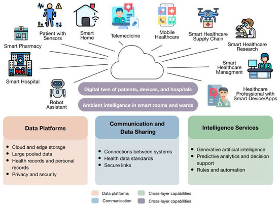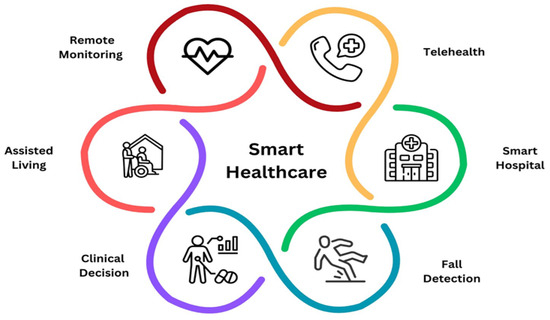 The origins of SHC can be traced back to the late 1980s [27], when the focus was on reducing human error and operational expenses through automation and sensor-based systems [28]. Over time, the concept has expanded to emphasize enhanced patient experience, operational efficiency, and the use of digital technologies throughout the healthcare continuum. Today’s SHC systems leverage information and communication technologies (ICTs) to offer efficient, personalized, and connected care services [29].