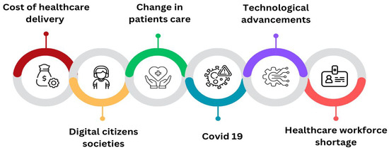 SHC systems have grown significantly in popularity due to their efficiency, user-friendliness, and ability to enhance patient care. As global advancements in technology and medicine continue, the adoption of SHC is expected to accelerate further. As shown in Figure 5, several major factors are driving this trend: rapid technological progress, the rise of digitally native populations, evolving patient care needs, shortages in the healthcare workforce, the rising cost of healthcare services, and the global impact of the COVID-19 pandemic.