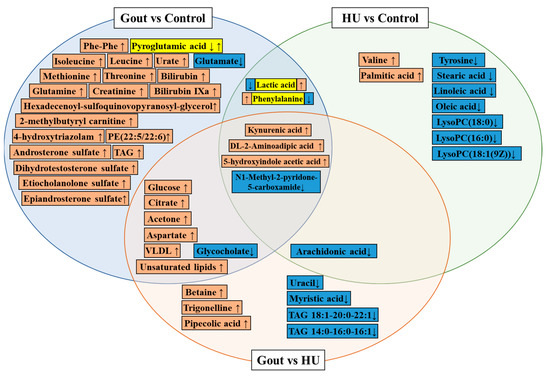 | Gout (109) vs. HU (102) | Betaine, trigonelline, pipecolic acid, | Glycocholate, uracil, myristic acid, arachidonate | Arginine biosynthesis↑ Glycine, serine, and threonine metabolism disorder | ||||