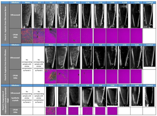 Ultrasound and Compensated Polarized Light Microscopic (CPLM) images from patient derived and in-house fabricated crystal suspensions. Panel A—Ultrasound and Compensated Polarized Light Microscope (CPLM) images from serial dilutions of the thick milky fluid collected from the olecranon bursa at the time of surgical resection of a large tophus. Panel B—Ultrasound and CPLM images from similar serial dilutions of thick milky fluid collected from aspirate of an acute gouty knee flare and effusion. Panel C—Ultrasound and CPLM images of serial dilutions of in-house derived synthetic crystals.