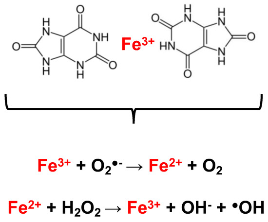 UA chelates iron and prevents redox reactions. With a stoichiometry of 2:1, UA can chelate free iron and hold it in a manner (upper panel) that diminishes its capacity for redox reactions (lower panel). Examples of these redox reactions include the Haber–Weiss and Fenton reactions catalyzed by ferric (uppermost reaction) and ferrous (lowermost reaction).
