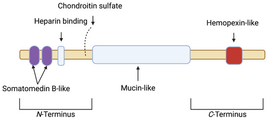 Schematic depicting the various motifs within the full length synovial 1404 amino acid proteoglycan 4 (PRG4) polypeptide. The N-terminus contains a somatomedin B-like domain, a heparin binding site and a chondroitin sulfate chain. The N-terminus is also the site for the disulfide bonding of PRG4 monomers. The central domain is mucin-like, and is responsible for boundary lubrication. The C-terminus contains a hemopexin-like domain.
