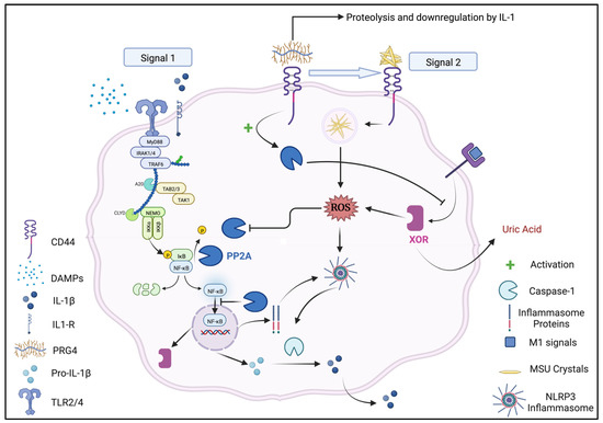 Macrophage activation by urate crystals and the role of the PRG4/CD44/PP2A axis. Mechanistic overview of the regulation of XOR-derived reactive oxygen species (ROS) generation in macrophages by protein phosphatase 2A (PP2A), and corresponding PP2A’s inactivation by XOR-derived ROS as the basis for PP2A’s role in gout inflammation. Resident macrophages are primed by IL-1β or by DAMPs (Signal 1). Both stimuli independently activate the NF-κB pathway, resulting in its nuclear translocation and expression of pro-IL-1β, inflammasome proteins, and XOR. PP2A regulates the NF-κB pathway via dephosphorylation of IκBα, which prevents the translocation of NF-κB. Under inflammatory conditions, PRG4 is downregulated at the gene level and/or proteolytically degraded, thus compromising the integrity of the PRG4/CD44/PP2A signaling pathway. Unoccupied CD44 receptors bind MSU crystals, which are then internalized by the macrophages (Signal 2). MSU crystals and macrophage M1 (pro-inflammatory) signals, including IL-1β and DAMPs, upregulate XOR expression, which results in increased XOR activity and production of urate; XOR activity-derived ROS can activate the NLRP3 inflammasome and inactivate PP2A. Inflammasome assembly activates caspase-1, which in turn converts pro-IL-1β to mature IL-1β.