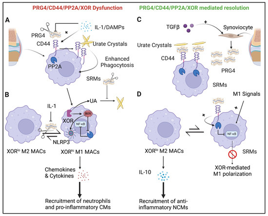 Foundation of synovial tissue homeostasis by the PRG4/CD44/PP2A/XOR circuit. The failure of this circuit includes (A) Inhibition of PRG4 synthesis and/or its degradation by proteases (denoted by scissors) in the setting of acute inflammation, while simultaneously increasing CD44 expression on synovium-resident macrophages (SRMs). Unoccupied CD44 mediates urate crystal uptake and downstream XOR expression. IL-1β and GM-CSF (gout mediators) also induce XOR in macrophages (MACs). (B) XOR drives SRMs towards XORhi M1 MACs, while PRG4 deficiency exacerbates M1 MAC accumulation. XOR products: urate (UA) is secreted into the joint space and promotes crystal deposition/growth, and reactive oxygen species (ROS) activate the NLRP3 inflammasome and inhibit PP2A activity. PRG4 also interferes with MSU crystal formation [83]. M1 MACs release chemokines and pro-inflammatory cytokines that recruit neutrophils and classical monocytes (CMs). Circuit reconstitution effectively resolves acute inflammation using the following mechanisms: (C) TGF-β upregulates PRG4, resulting in “cloaking” of CD44 on SRMs and inhibition of urate crystal phagocytosis. (D) PRG4 binding CD44 activates intracellular PP2A, inhibits NF-κB, and prevents M1 polarization. XORlo M2 MACs secrete IL-10, which promotes the viability of and preferential differentiation into anti-inflammatory/wound-healing M2 MACs of the non-classical monocytes (NCMs) that have surged into the acutely inflamed gouty joint.