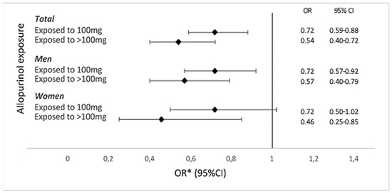 Abstract: Background: Gout is associated with an increased risk of cardiovascular disease, with accumulated evidence that gout is an independent risk factor. Whether allopurinol use alters this risk is not clear. The aim of this study was to investigate the effect of allopurinol use on the risk of first-ever acute coronary syndrome (ACS) in patients with incident gout. Methods: Using data from population-based registers, we identified all patients in Western Sweden with a first ICD-coded diagnosis for gout in the period 2007–2017 and without any previous allopurinol exposure (n = 19,054; 67% males). Patients with a prior history of coronary heart disease were excluded. The outcome of interest was the occurrence of a first-ever ACS event in the compulsory health care registers. The follow-up began from the first ICD-coded diagnosis for gout, and ended at the earliest of the following: the outcome, death, emigration, or the end of the study, on 31 December 2017. Exposure to allopurinol at the end of follow-up was defined as: none (reference group), 100 mg, or >100 mg, according to the last dispensed prescription within 125 days from the end of follow-up. Odds ratios (ORs) and 95% confidence intervals (CIs) for a first-ever ACS event were calculated using logistic regression with adjustments for age, sex, education, comorbidity index (based on the number of ever-diagnosed comorbidities, see included comorbidities in footnote of Table 1), dispensed prescriptions for cardiovascular drugs, anticoagulants/ platelet aggregation inhibitors, and/or cortisone within six months from the end of follow-up, and follow-up time. Results: Women were older than men in all exposure categories (Table 1). Exposure to allopurinol was associated with older age, a longer follow-up time and more comorbidities (Table 1). Exposure to 100 mg and >100 mg allopurinol had a significantly lower OR for a first-ever ACS event, as compared to those not exposed, overall (OR, 0.72; 95% CI, 0.59–0.88; and OR, 0.54; 95% CI, 0.40–0.72, respectively), and in men (OR, 0.72; 95% CI, 0.57–0.92; and OR, 0.57; 95% CI, 0.40–0.79, respectively). In women, exposure to >100 mg was associated with a significantly lower OR for a first-ever ACS event (OR, 0.46; 95% CI, 0.25–0.85), whereas exposure to 100 mg was not (OR, 0.72; 95% CI, 0.50–1.02). Exposure to >100 mg allopurinol was associated with a lower OR for a first-ever ACS event than exposure to 100 mg in both men and women (Figure 1). The ORs for a first-ever ACS event were similar in men and women. Conclusion: Current allopurinol use was associated with a significantly lower risk of a first-ever ACS event in patients with incident gout in a dose-dependent fashion, suggesting a protective effect for allopurinol. The effect of allopurinol was similar in men and women.