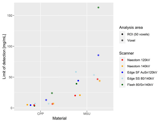Comparison of limit of detection between scanners. Comparing quantitative detection limits of crystals per voxel reveals superiority of PCD-CT over all EID-CT methods. In PCD-CT, gout-related crystals (MSU) can be detected at a minimum concentration of under 50 mg/mL in a single voxel.