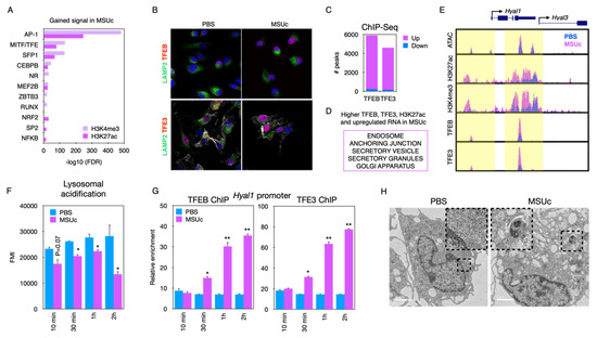 Motifs analysis: (A) IF for TFEB or TFE3, (B) Cellular sub-localization of TFEB and TFE3, (C) ChIP-Seq for TFEB or TFE3 for macrophages treated with MSUc for 5 h. (D) Pathway analysis, (E) Composite showing Hyal1 and Hyal3 genomic loci, (F) Lysosomal acidification or (G) locus-specific ChIP-qPCR of TFEB or TFE3 at various timepoints, (H) TEM imaging showing lysosomal damage.
