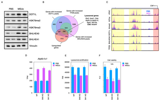 (A) Protein analysis using Western blot. (B) Venn diagram of gained DOT1L, BHLHE40, TFEB ChIP-Seq peaks. (C) Composite of Cd9 locus. (D) RNA-Seq expression of Atp6v1c1. (E,F) Lysosomal acidification or cell viability of WT, Bhlhe40 KO or Bhlhe41 macrophages stimulated with MSUc for 5 h.