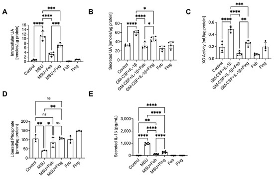 Uric acid (UA), xanthine oxidase (XO) and protein phosphatse-2A (PP2A) activities and interleukin-1 beta (IL-1b) secretion by urate (MSU) crystals stimulated BMDMs. PP2A activation was performed using fingolimod (Fing; 2.5 mM). (A,B) Fing reduced intracellular UA levels. (C) Fing reduced XO activity. (D) Fing and Feb enhanced PP2A activity. (E) Fing reduced IL-1b secretion.