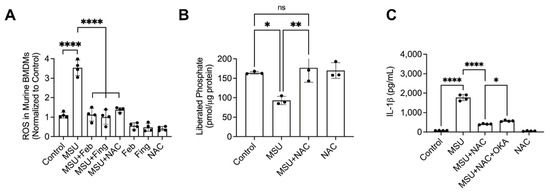 Urate crystal-induced generation of reactive oxygen species (ROS) and its relationship to protein phosphatase-2A (PP2A) activity in BMDMs. PP2A activation was performed using fingolimod (Fing; 2.5 mM) and N-acetylcysteine (NAC) treatment was performed at 10 mM. (A) Fing reduced ROS generation. (B) NAC treatment enhanced PP2A activity. (C) PP2A inhibition reduced NAC treatment efficacy.
